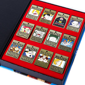 This set includes 12 pieces of well-crafted accessories, each featuring a wanted poster design of a different One Piece crew member.
